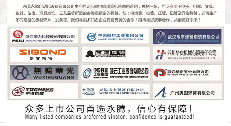 東莞永騰自動化設(shè)備有限公司(vinston)是一家專業(yè)生產(chǎn)CNC多軸多功能無凸輪電腦彈簧機、線材成型機和銅鋁排折彎機的美國獨資企業(yè)。本公司從2001年開始運用美國先進的伺服控制技術(shù)進行一次具有重要意義的技術(shù)改革,打破傳統(tǒng)的凸輪帶動成型模式,成為行業(yè)創(chuàng)新的無凸輪模式兼?zhèn)錂C械手的彈簧機??杉庸ぞ€徑0.15-12mm范圍彈簧及線材成型。