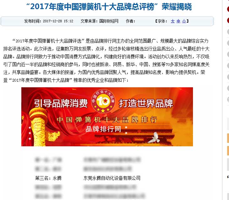 永騰榮獲2017年度中國彈簧機十大品牌日期:2018-01-05???? 人氣:1660