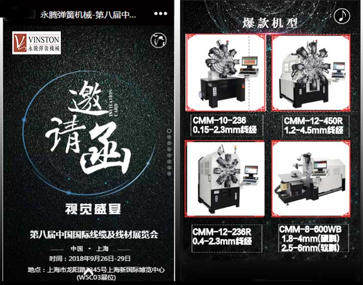 第八屆中國國際線纜及線材展覽會將于2018年9月26日-29日在上海新國際博覽中心召開。此次展會永騰彈簧機械將派出四款主打機型 CMM-12-450R 彈簧機、CMM-12-236R 轉(zhuǎn)線機、CMM-10-236彈簧機、CMM-8-600WB線材成型機。歡迎各位蒞臨我司展會。