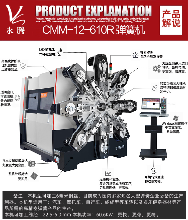 3、全部采用雙導軌,滾珠絲桿傳動、以保證長久保持精度和力度。可加工6mm鋼絲。目前成為國內(nèi)多家知名大型彈簧企業(yè)必備的生產(chǎn)利器。