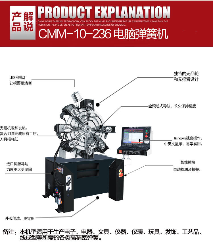獨(dú)特的無凸輪和無搖臂設(shè)計(jì),由6組伺服馬達(dá)獨(dú)立控制,可以生產(chǎn)各種各樣異型彈簧、壓簧、雙扭簧、電池簧、扁簧(發(fā)條簧)及各種線成型等。精密準(zhǔn)確、調(diào)機(jī)快速、穩(wěn)定可靠。